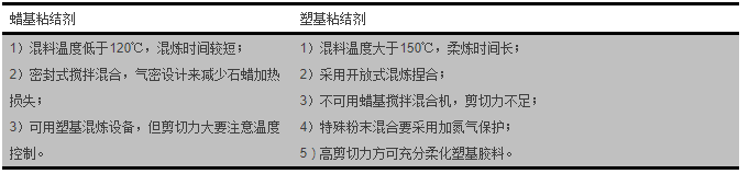 之前,我們有一篇文章介紹了塑基、蠟基粘結(jié)劑組成上的差別,今天,我們來介紹一下塑基、蠟基粘結(jié)劑在混煉、注塑、脫脂和燒結(jié)制程上的差異。