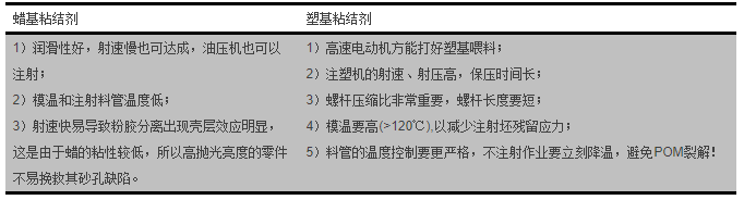塑基粘結(jié)劑則需要高速電動注塑機,螺桿要短,射速、射壓、模溫高,保壓時間長;另外,料管的溫度控制要更嚴(yán)格,不注射作業(yè)要立刻降溫,避免POM裂解!