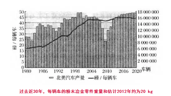 金屬粉末工業聯合會(MPIF)是北美的一家粉末冶金商業協會,其最近報告美國制造的轎車中用的粉末冶金零件可能為325項,按單個零件計算約有1,000件,2013年的總重量略微增高為20.18kg;而2012年為19.95 kg.可是在歐洲生產的轎車中粉末冶金零件的裝用量,甚至2012年仍然只有8.79 kg,而在日本的一般轎車中粉末冶金零件的裝用量2012年略微減低到了9.07 kg。據MPIF所報告的,北美地區的粉末冶金產業最重要的是汽車市場,生產的粉末冶金結構零件約73%用于了北美的轎車與貨車。北美的粉末冶金零件消耗量緊跟汽車的產量。