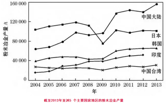 亞洲的粉末冶金產量,自2009年中國大陸超過日本之后,現在中國是最大的粉末冶金生產國。2013年,中國大陸的粉末冶金產量驟增到了接近160000t,而2012年只有約140000t。